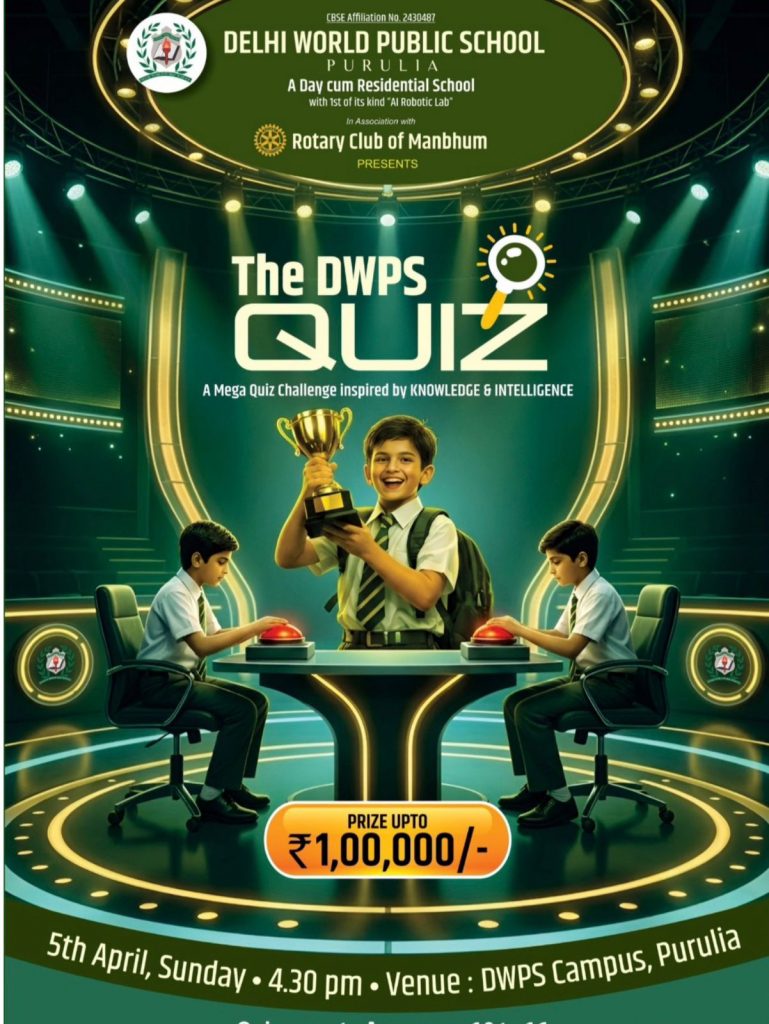 Delhi World Public School (DWPS), Purulia will organise a Mega Quiz Competition on 5th April at its campus, offering prizes worth up to Rs. 100000. The competition is being organised in association with Rotary Club Manbhum and is open to students in the age group of 10 to 16 years. Registrations are currently open through the school’s official website with a participation fee of Rs. 399.